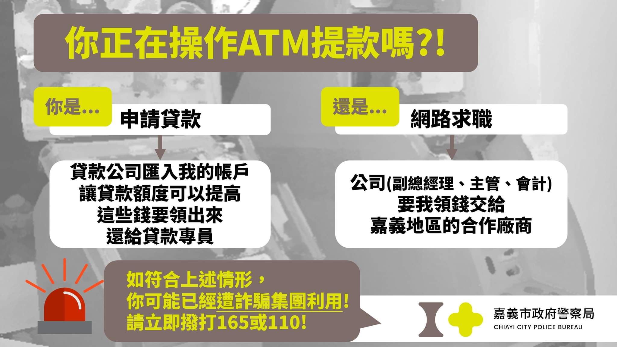 遇有上述情形,請立即撥打165或110,聯繫警方派員到場協助,讓我們一起打擊詐騙集團!