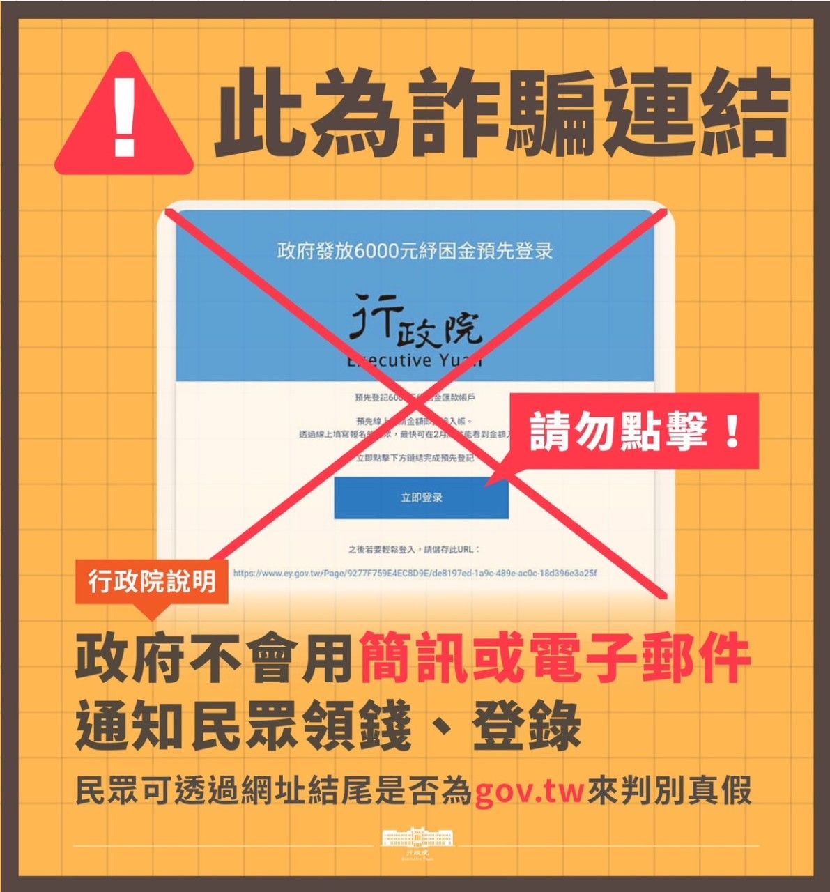 165專線提醒您,請慎防詐騙簡訊或電子郵件,另請留意,我國政府網址首段結尾均為「 .gov.tw 」,切勿點擊各類不明來源的連結及提供個人資料,避免遭詐。
