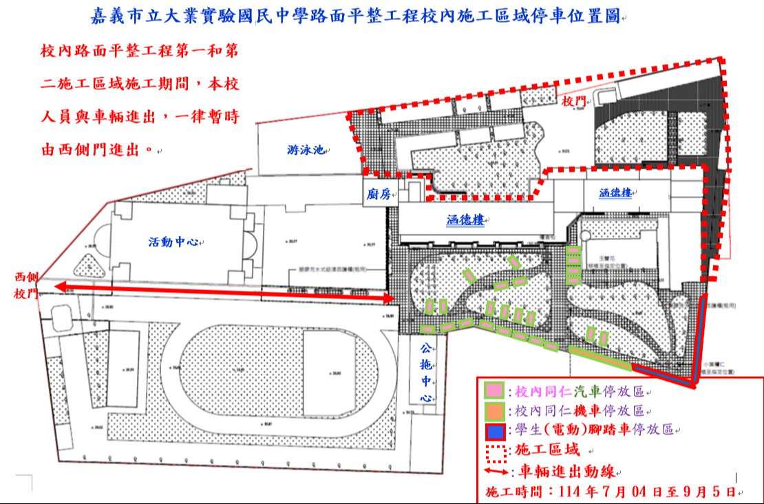 本校目前正在進行校園路面整平工程,煩請各位民眾與師生不要進入施工區域。本工程分為三個施工區域,目前工程進度調整施工區域為第一和第二施工區域並公告相關訊息,煩請大家配合,謝謝!!
