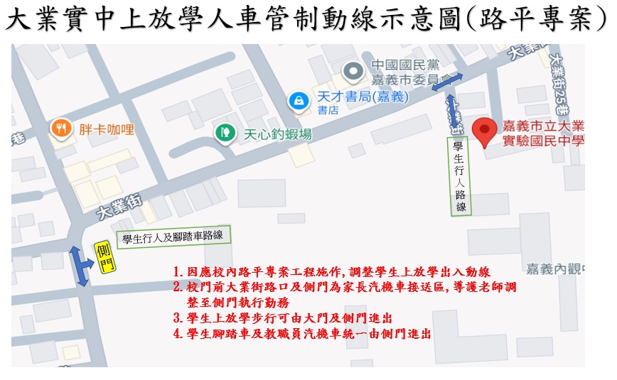 因本校進行校園工程施工,為確保學生上下學安全及維持交通順暢,敬請各位家長及學生配合以下事項: