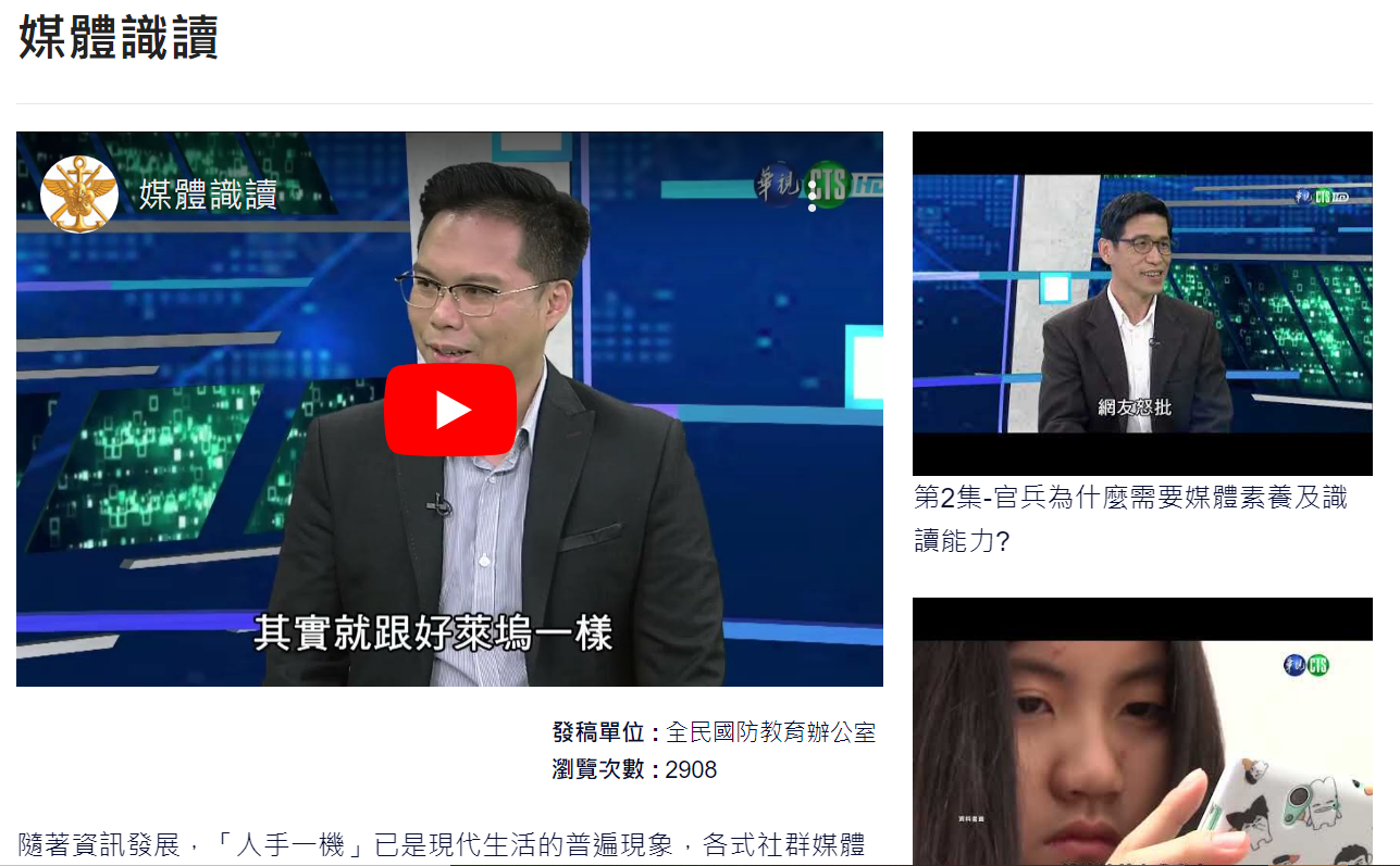 教育影片刊登在「全民國防教育」全球資訊網「媒體識讀專區」(https://aode.mnd.gov.tw/Unit/index/364)