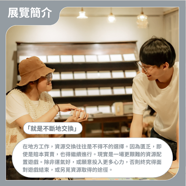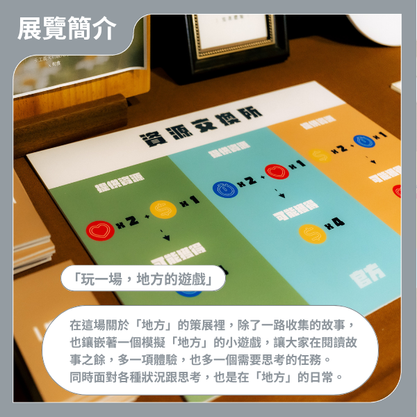本次展覽以「地方」為名,收納許多縣市各種體驗,除議題展、攝影展,亦是一場走進地方的遊戲體驗,用第一人稱去面對地方課題,每一個關卡鑲嵌不同互動體驗。相關資訊如下: