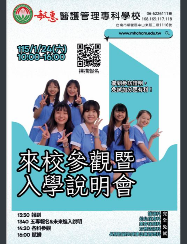 四、活動地點:敏惠醫護管理專科學校 (臺南市柳營區中山東路二段1116號)。