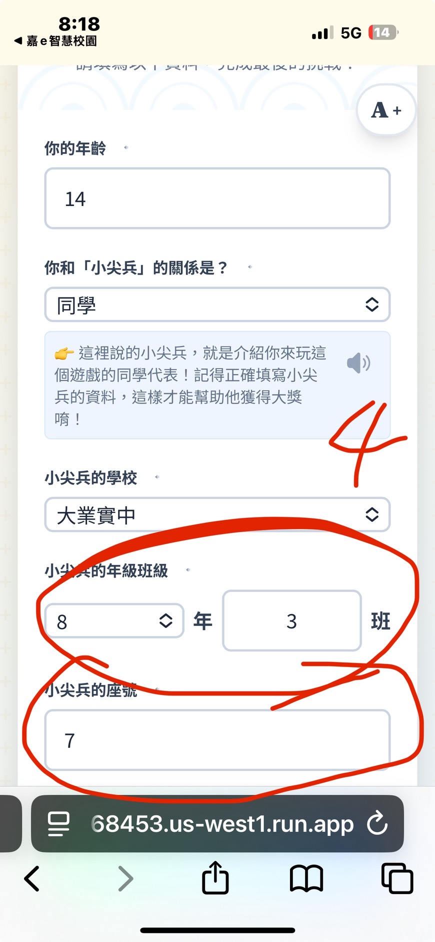 STEP4:完成任務後,填寫回饋,並留下本校校園防詐小尖兵的「班級、座號」(803班,7號,劉同學)。
